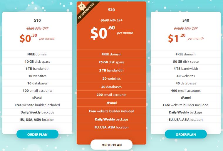 本次圣诞特惠期间,您可使用前文Hostens优惠码下单,新购美国虚拟主机、欧洲主机或亚洲主机等产品可享1折优惠,一次性购买时间越长价格就越便宜,购买3年价格最便宜,每月折算下来只要0.3美元,3年一共也就3.6美元。